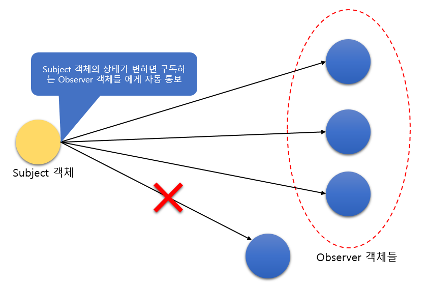 옵저버 패턴은 한 객체의 상태가 변경이 되면 그 객체에 의존하고 있는 다른 객체들한테 연락이 가고 자동으로 내용이 갱신되는 방식으로 일대다( one to many ) 의존성을 가진다.